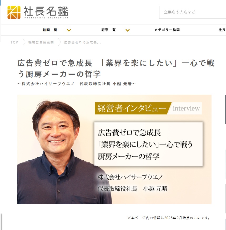 『社長名鑑』様に掲載されました! 社長の小越が『社長名鑑』様に掲載されました。 お話をいただきまして誠に有難うございます。 ハイサーブの【柱】になることが満載です。 是非、ご一読ください。 掲載URL https://shachomeikan.jp/industry_article/4929 2025年9月29日 お知らせ 厨房設計 その他 [RSS][XML]