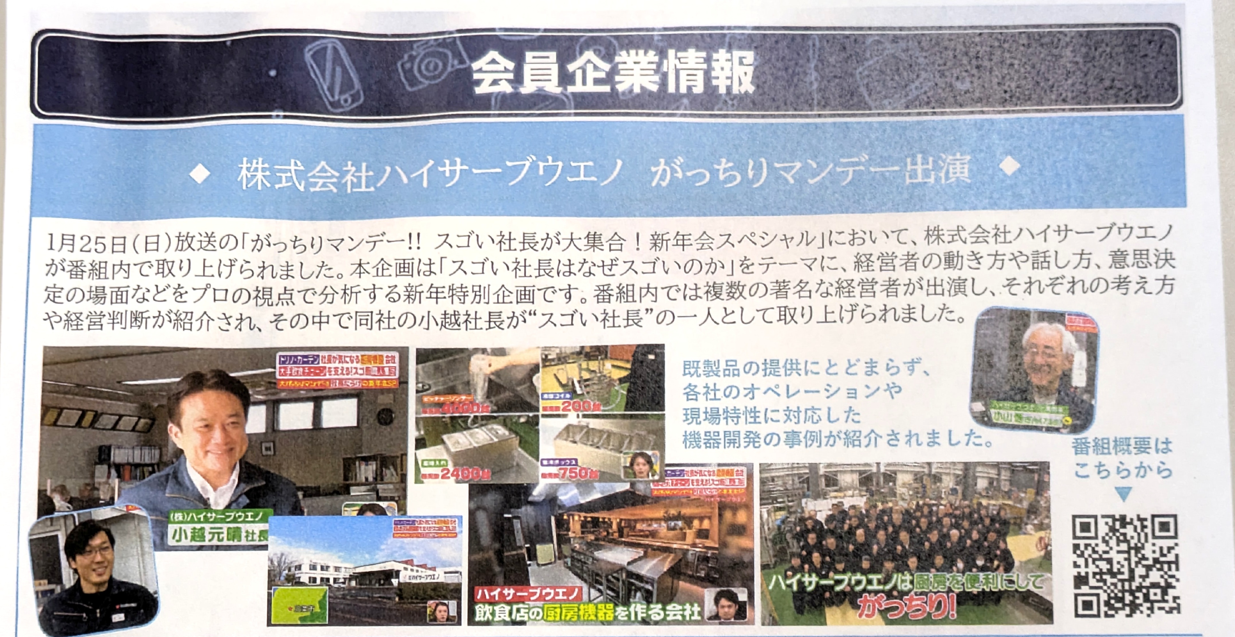 アイアールマーズ様 伝挑レターに掲載されました! 『がっちりマンデー』に出演したことが アイアールマーズ様の伝挑レターに取り上げて頂きました。 誠にありがとうございます。 がっちりマンデー出演後、工場見学に 足を運んでいただく方が増えました。 嬉しい限りです。 工場見学大歓迎です! 事前連絡をお願い致します。 2026年3月12日 お知らせ その他 [RSS][XML]